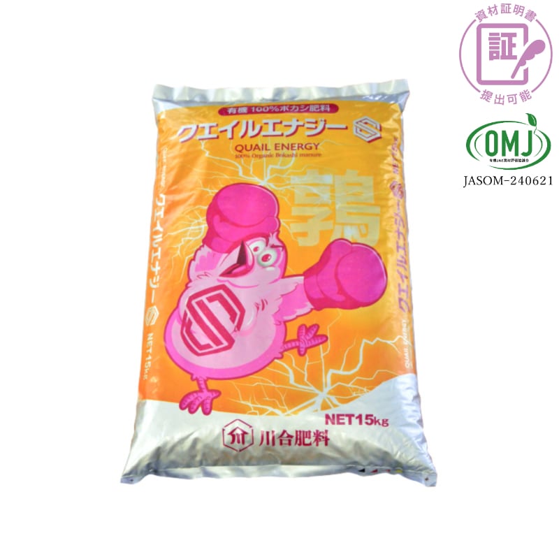 クエイルエナジーは良質なうずらふんをベースに、米ぬか、フェザーミール、カツオ粕、コンブ粕、カニガラを加え、丁寧に発酵したボカシ肥料です。